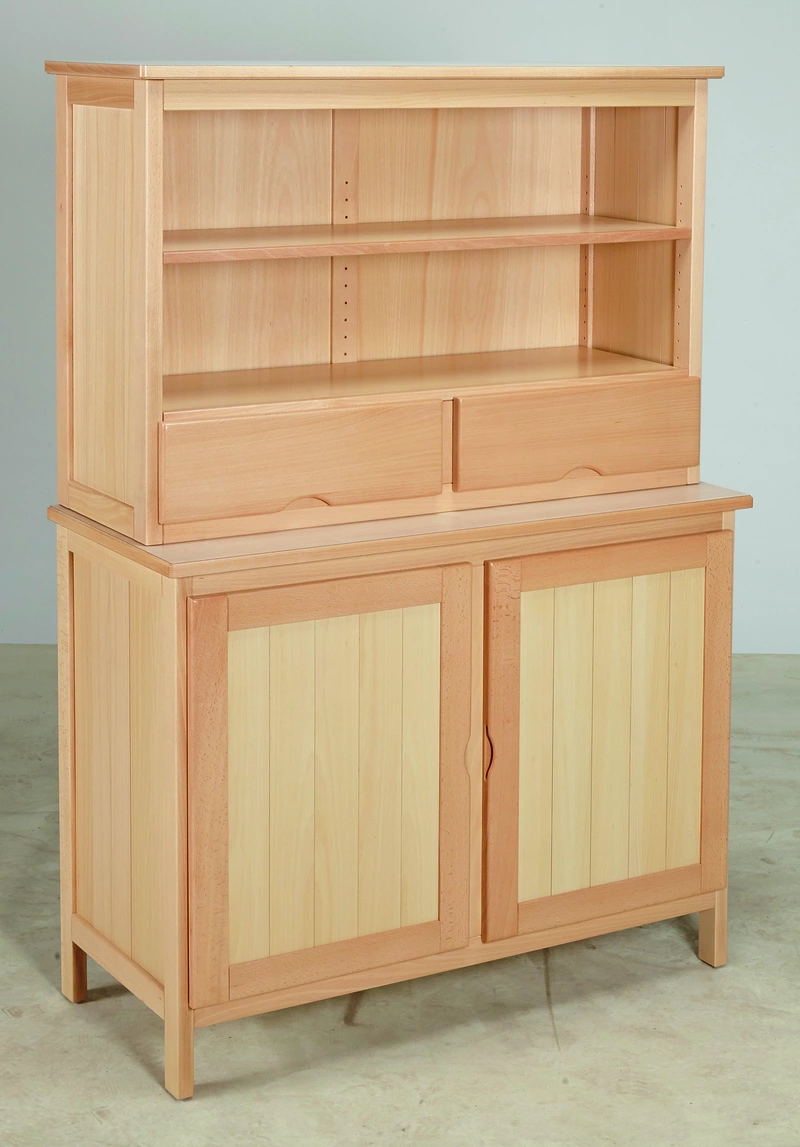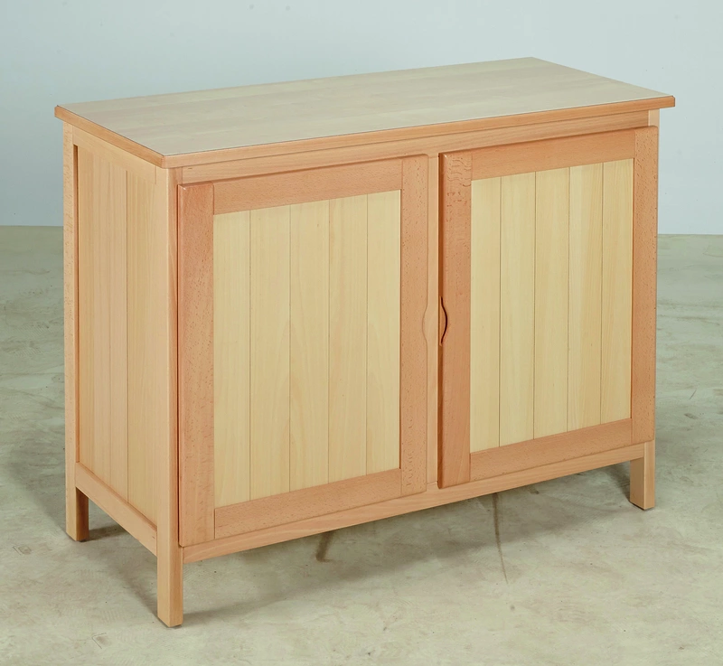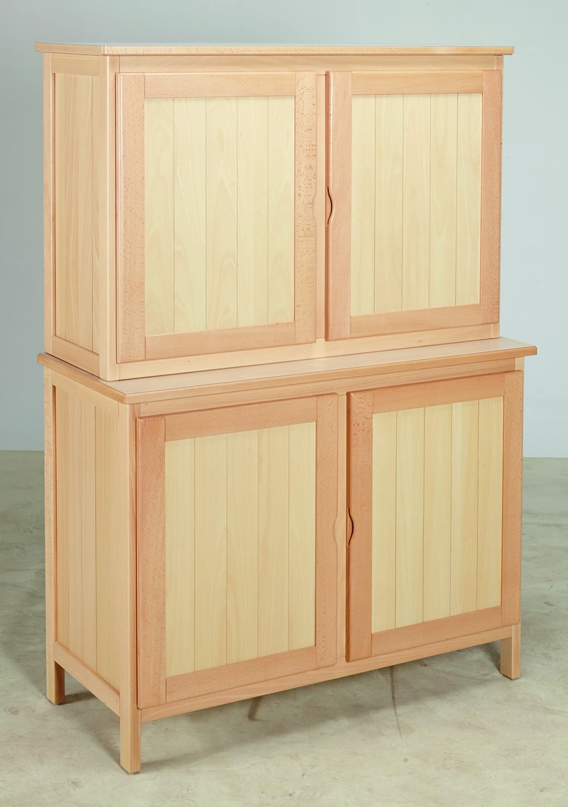 Le plateau est en stratifié , l'intérizeur des portes et côtés en MDF plaqué hêtre, la structure et l'encadrement des portes en hêtre massif.