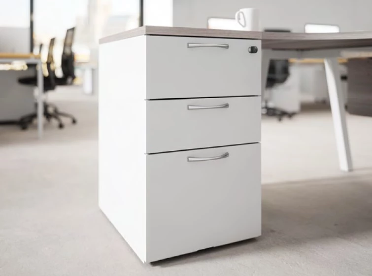 Un caisson de rangement de proximité à la hauteur du bureau.