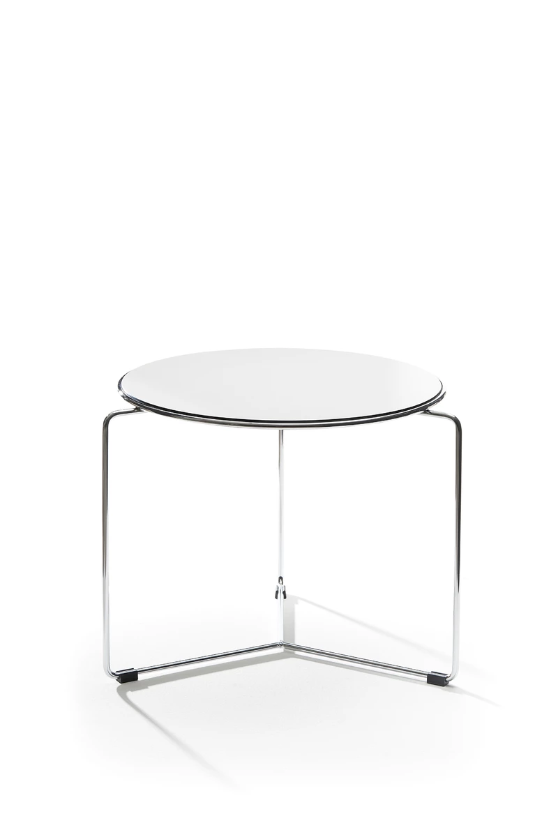 Sa structure en tube de métal sur 3 pieds lui confère un look design et minimaliste. Elle supporte un plateau rond de 49 cm de diamètre.