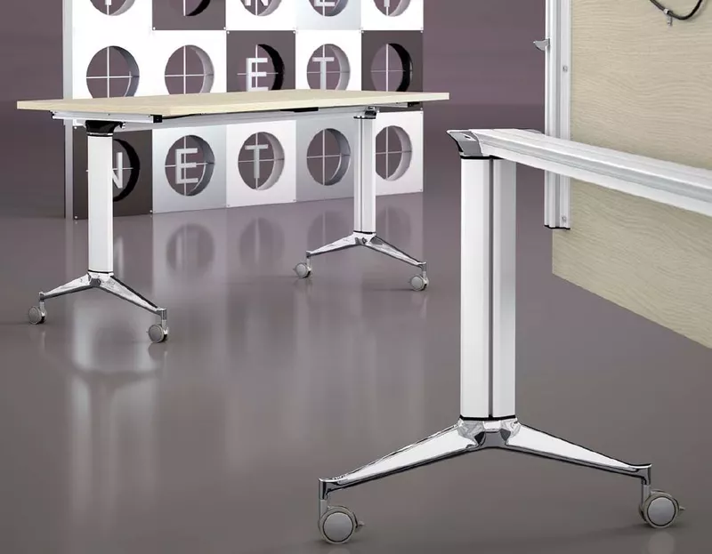 Grâce à ses pieds sur roulettes (avec freins), il sera facile de mettre en place une salle de réunion, puis de ranger les tables pour récupérer l'espace pour un autre usage.