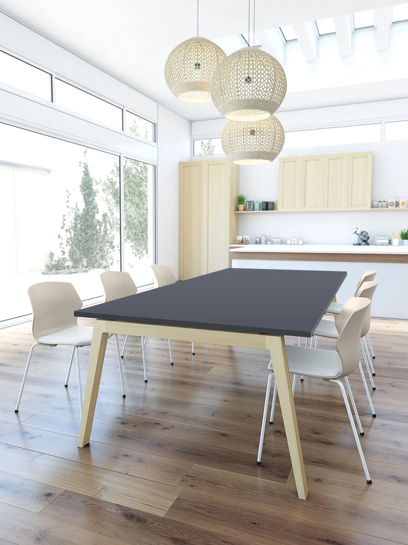 Cette table de réunion est assortie aux bureaux Bench Born. Elle se décline dans différentes dimensions. Elle est constituée d'un ou deux plateaux de 25 mm d'épaisseur selon sa longueur et repose sur des pieds en hêtre massif.